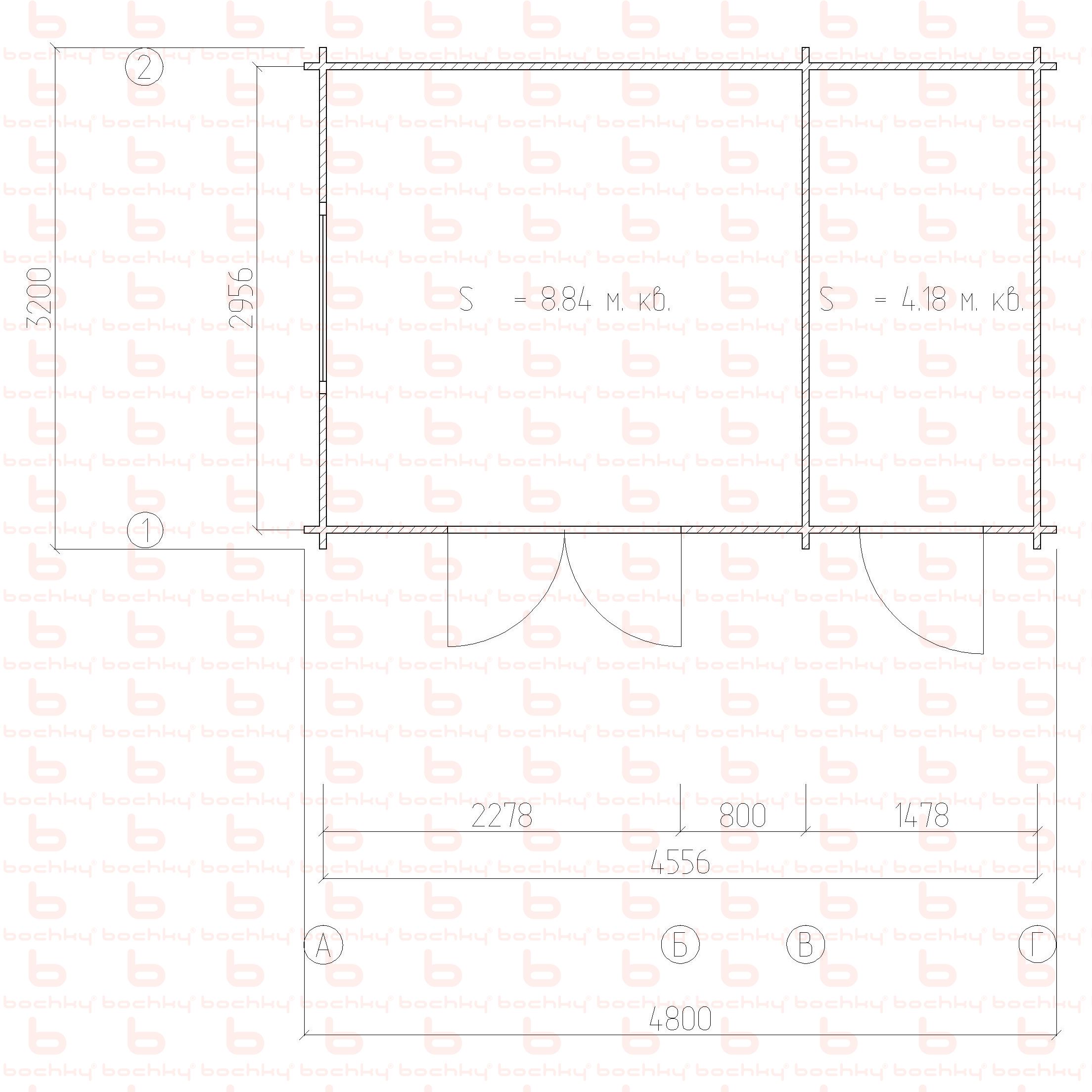 Наружные стены (16 венцов — высота стены 2,2 м), фронтоны и перегородки Профилированный строганный мини-брус камерной сушки сечением 44х143 мм, влажность 10-12%